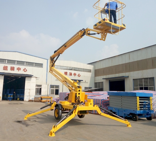 牽引折臂式液壓升降機(jī)采用電瓶動(dòng)力電源升降